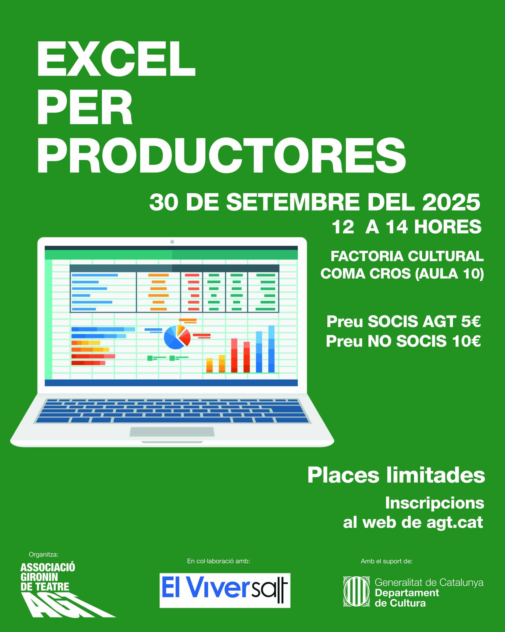 L’AGT (Associació Gironina de Teatre) organitza un curs pràctic d’Excel per a productores dirigit a professionals de les arts escèniques i culturals.