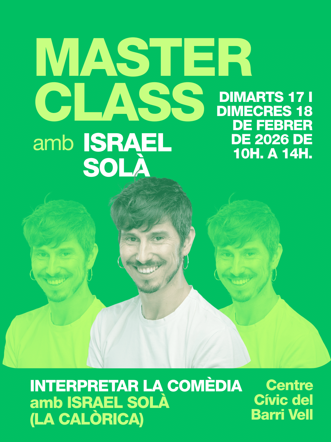 El dimarts 17 i el dimecres 18 de febrer, de 10:00 a 14:00 h, al Centre Cívic del Barri Vell, tindrà lloc la Masterclass Interpretar la comèdia, impartida per Israel Solà García, director i dramaturg de reconeguda trajectòria i fundador de la companyia La Calòrica. Aquesta masterclass està pensada per a actors i actrius que volen aprofundir en les tècniques d’interpretació teatral còmica i explorar els matisos de la comèdia des d’una mirada contemporània i pràctica.