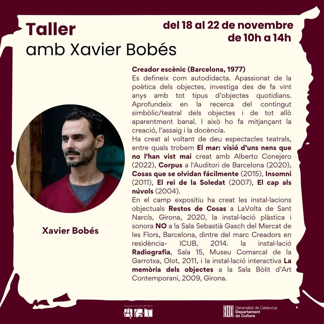 En aquest taller -des d’una aproximació eminentment pràctica- vull compartir alguns dels materials i les eines que m’han acompanyat en la meva trajectòria en el Teatre d’Objectes. A través de diferents exercicis i dinàmiques -grupals i individuals- explorarem la potencialitat escènica dels objectes fins a trobar diferents partitures de manipulació.