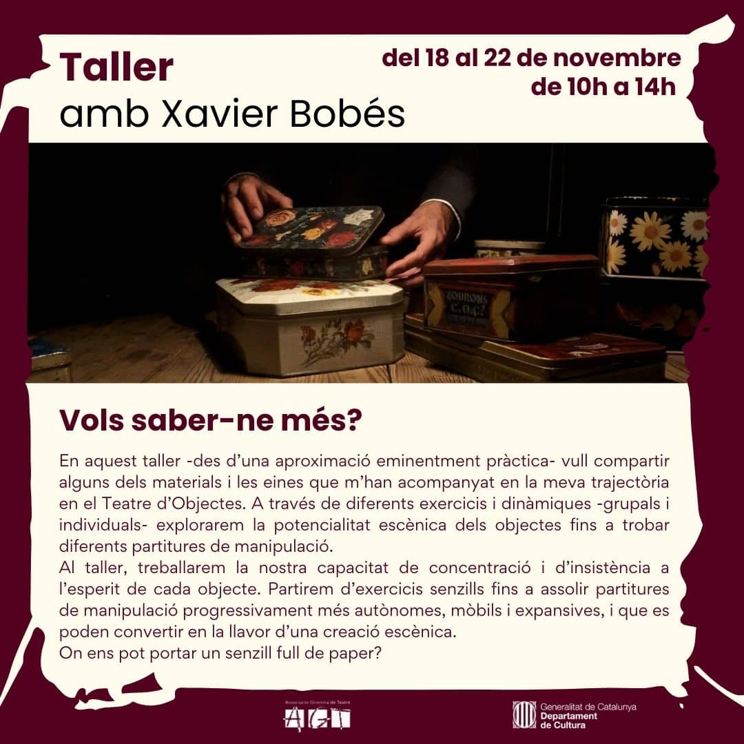 Al taller, treballarem la nostra capacitat de concentració i d’insistència a l’esperit de cada objecte. Partirem d’exercicis senzills fins a assolir partitures de manipulació progressivament més autònomes, mòbils i expansives, i que es poden convertir en la llavor d’una creació escènica.